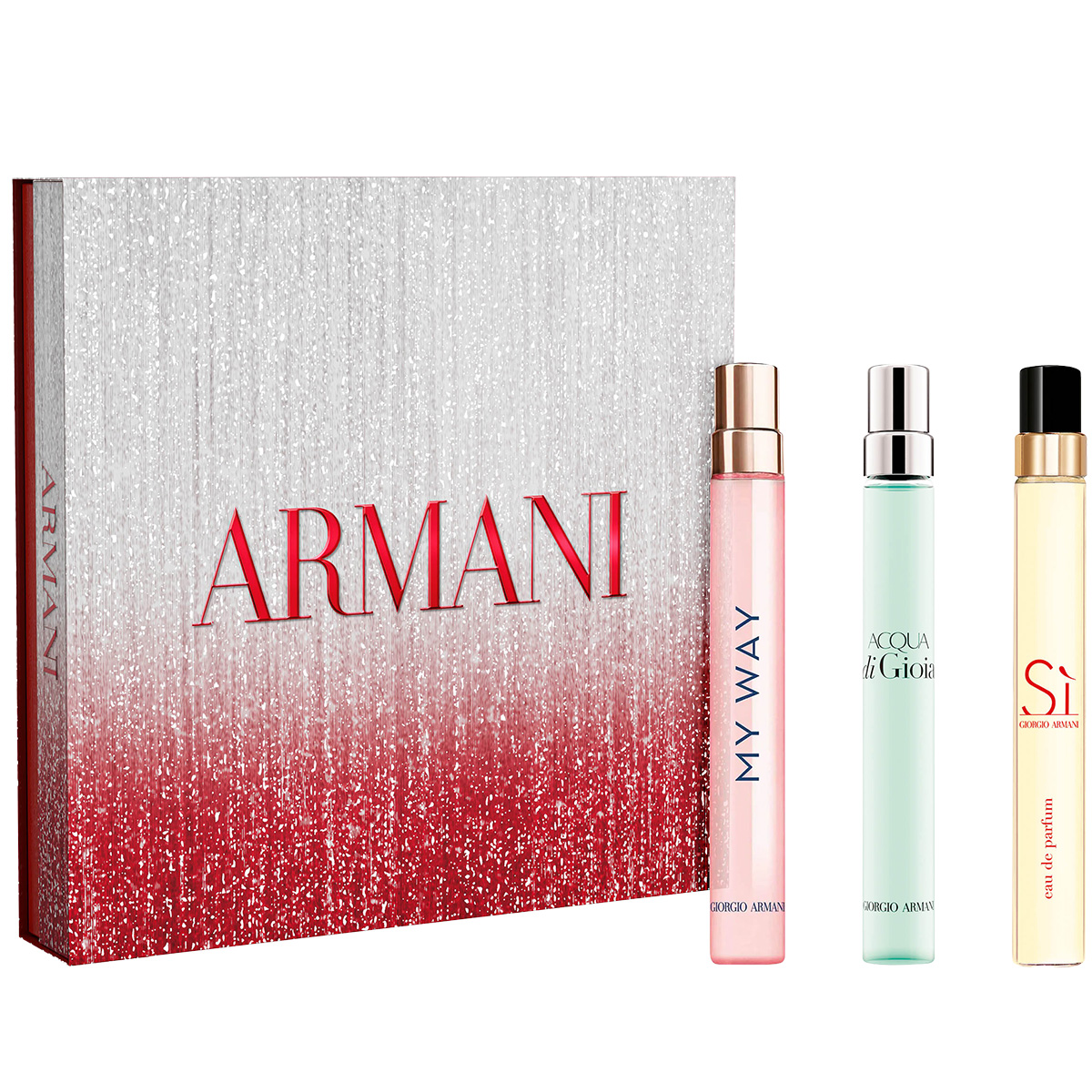 Tänä jouluna Armani esittelee eksklusiivisen punaisen ja hopeanvärisen gradienttilahjapakkauksen, joka sisältää kolme sen ikonisinta naisten tuoksua. Trio Holiday -setti sisältää My Way Eau de Parfumin, Acqua di Gioia Eau de Parfumin ja Sì Passione Eau de Parfumin, kukin 10 ml:n koossa. My Way tarjoaa valoisia kukkaistuoksun ja ambran vivahteita appelsiininkukalla ja tuberoosalla. Acqua di Gioia tuo merellistä raikkautta sitruunalla ja jasmiinilla, kun taas Sì Passione ilmentää rohkeaa intohimoa ruusulla, jasmiinilla ja mustaherukalla.