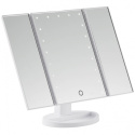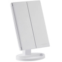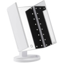 Kokoontaitettava peili, jonka kolme eri peiliosaa antavat täydellisen panoraamakuvan kasvoistasi. Peilissä on 21 säädettävää, pehmeän kirkasta LED-valoa, jotka heijastavat värejä täydellisesti ja antavat juuri sopivasti valoa meikkaamiseen tai kulmien muotoiluun. Valon voimakkuutta on mahdollista säätää eri tarpeisiin sopivaksi peilin kehyksessä olevasta kosketuspainikkeesta. Valot voi kytkeä päälle tai pois päältä painamalla kosketuspainiketta, ja valojen säätäminen tapahtuu pitämällä painiketta painettuna vähintään kahden sekunnin ajan. Peiliä on helppo kääntää parhaan mahdollisen kulman saamiseksi. Kokoontaitettava peili koostuu kolmesta eri peiliosasta, joita kääntämällä voit nähdä itsesi monesta eri kulmasta – tuloksena on upea kolmiulotteinen näkymä. Säädettävän jalustan ansiosta peili voidaan asettaa mille tahansa tasaiselle alustalle, mikä jättää molemmat kädet vapaiksi. Lamput toimivat USB-kaapelilla (mukana pakkauksessa) tai neljällä AAA-paristolla (ei mukana). Paristot eivät kulu, kun peili on kytketty USB-virtalähteeseen.