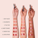 Vesipitoinen kiiltävä yhdiste saa huulet näyttämään aistillisen kosteilta. Värikidemikropigmentit saavat aikaan kirkkaan ja tasaisen värin sekä tekevät huulista luonnollisen näköiset. Kermainen rakenne on helppo levittää huulille.