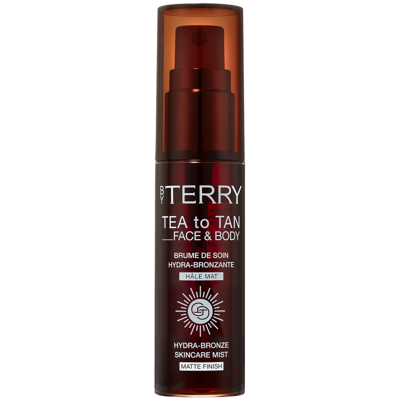 10 vuotta tuotteen luomisen jälkeen BY TERRY uudistaa ikonisen Tea to Tan Face & Body -suihkeensa. Tämä kosteuttava ihonhoitosuihke on uudistettu täysin uudella koostumuksella ja uudella pakkauksella. Se on ainutlaatuinen sekoitus ihonhoitoa ja täydellistä itseruskettavaa luomaan suojaavan kosteutuksen ja luonnollisen aurinkoisen hehkun. Sen vesipohjainen koostumus antaa iholle pitkäkestoisen sävyn luomatta peittävää pintaa.Huolellisesti suunniteltu koostumus, jossa on 97 % luonnollisesti valmistettuja ainesosia ja on rikastettu suojaavalla mustalla teellä ja tasoittavalla punaisella teeyhdisteellä sekä aktiivisen kirsikan bioyhdisteen elvyttävällä vaikutuksella, kosteuttaa ja ruskettaa jopa 24 tunnin ajan ja lisää ihon kosteuspitoisuutta ensimmäisestä levityskerrasta lähtien. Kevyt, raikas koostumus kuivuu nopeasti iholle ja antaa helpon, tasaisen levityksen luomatta peittävää pintaa tai värjäämistä. Lumoava tuoksu vahvistaa aistien kokemusta jokaisella käyttökerralla ja vie sinut kuin ihanalle matkalle. Sopii kaikille ihotyypeille ja ihonsävyille.