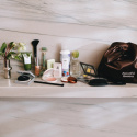 Kaksivuorinen satiininen meikkilaukku Bangerheadin tunnusomaisessa ruskeassa sävyssä, valkoisella kirjonnalla.Aim Higher Palette (Full Size) – LH Cosmetics