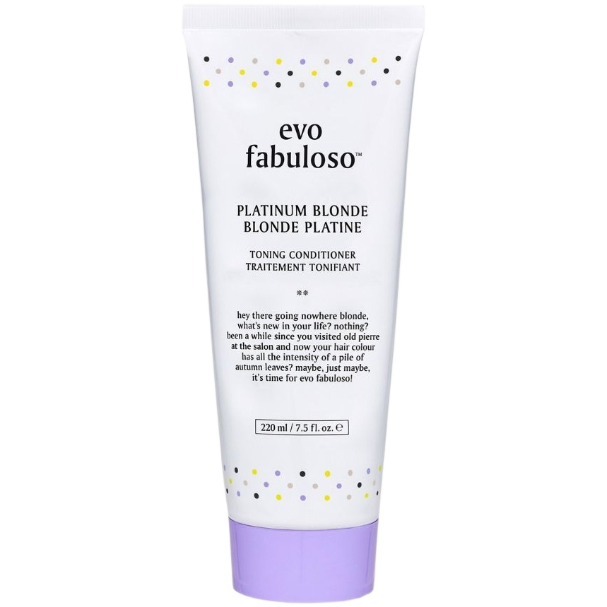Evo Fabuloso Platinum Blonde -tuotetta suositellaan värjätyille vaalennetuille tai raidoitetuille hiuksille, joissa halutaan vähentää keltaista pigmenttiä. Fabuloso on korjaava värihoito, jossa on korkea pigmenttipitoisuus. Se estää sähköisyyttä, kosteuttaa ja antaa kiiltoa.