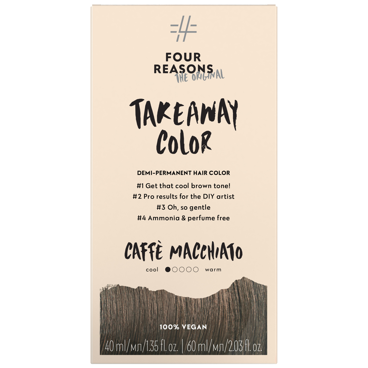 Take Away Color on kotikäyttöön tarkoitettu ammoniakiton ja hajusteeton kestosävyte, joka antaa kauniin ja kiiltävän värjäystuloksen. Peittää harmaat jopa 70 % ja antaa hellävaraisesti luonnollisen tuloksen.