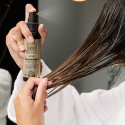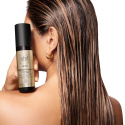 Vaihe 1: Levitä kosteisiin hiuksiin: hiussuomut ovat 50 % avoimempia kosteina, mikä mahdollistaa tuotteen syvemmän imeytymisen hiukseen ja maksimoi sen hyödyt sen sijaan, että se jäisi vain hiuksen pinnalle.