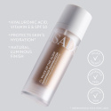 Kevyt, valoisa meikkivoide, jonka sisältämä hyaluronihappo ja E-vitamiini + SPF 50 suojaavat välittömästi ihon luonnollista kosteutta.*