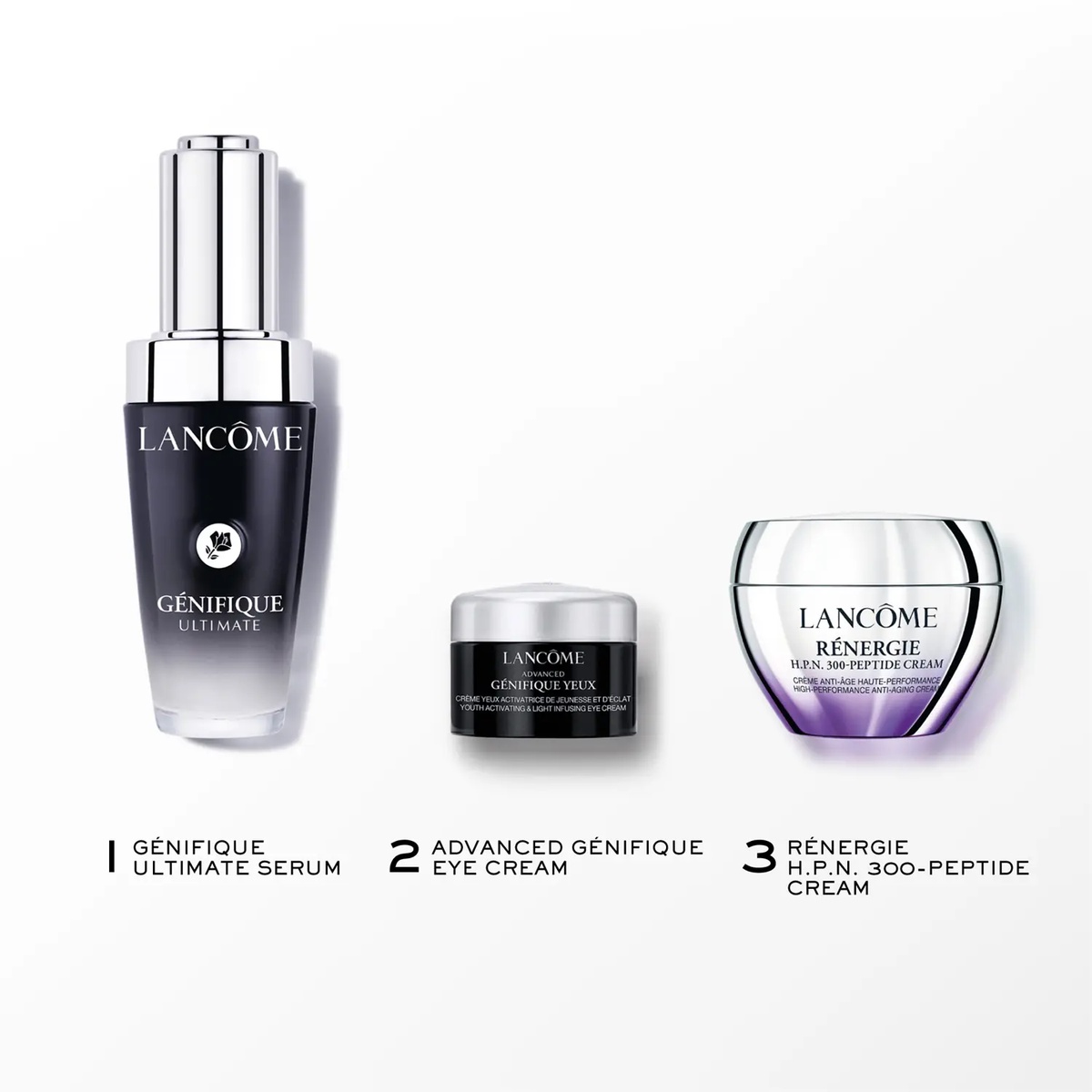 Lancôme Génifique Day Routine -setti yhdistää edistyksellisen korjaavan teknologian ja ylellisen päivittäisen ihonhoidon. Settiin kuuluvat Génifique Ultimate Serum, päivävoide ja silmänympärysvoide, jotka sisältävät Beta Glucan-CM:ää, hyaluronihappoa, lakritsijuuriuutetta sekä seitsemää pre- ja probioottista fraktiota. Tämä kokonaisuus tukee ihon uudistumista, rauhoittaa punoitusta, tekee ihon pinnasta tasaisemman ja auttaa ennalta ehkäisemään varhaisia ikääntymisen merkkejä. Sopii kaikille ihotyypeille, myös herkälle iholle sekä toimenpiteiden jälkeiseen ihonhoitoon, ja parantaa ihon heleyttä, napakkuutta ja laatua. Tarkka pipetti ja uudelleentäytettävä pakkaus tekevät päivittäisestä rutiinista tehokkaan, miellyttävän ja vaivattoman.