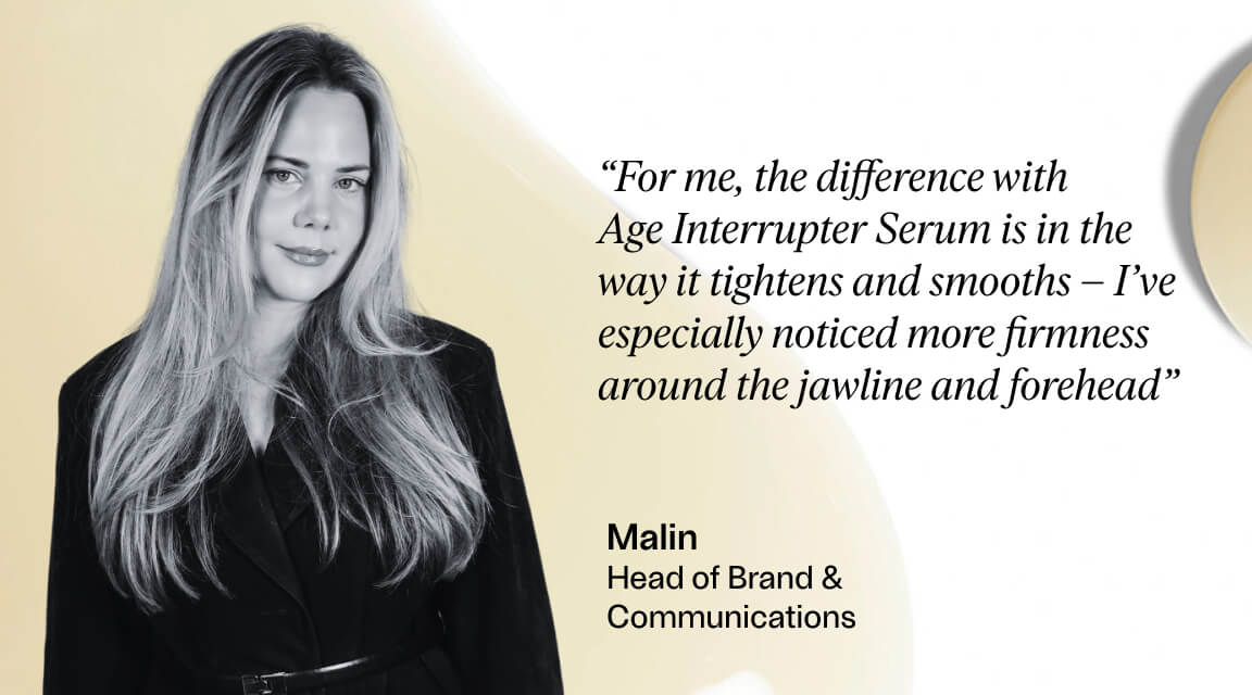 ”Ero A.G.E. Interrupter Ultra Serumin kanssa on siinä, miten se kiinteyttää ja tasoittaa – olen erityisesti huomannut vaikutuksen leukalinjassa ja otsassa. Sekaihoisena olin vaikuttunut siitä, kuinka kevyt ja samettinen koostumus tuntuu, mutta silti tehokas, antaen näkyvää napakkuutta ilman raskasta tai rasvaista tunnetta.” – Malin, Head of Brand, Bangerhead