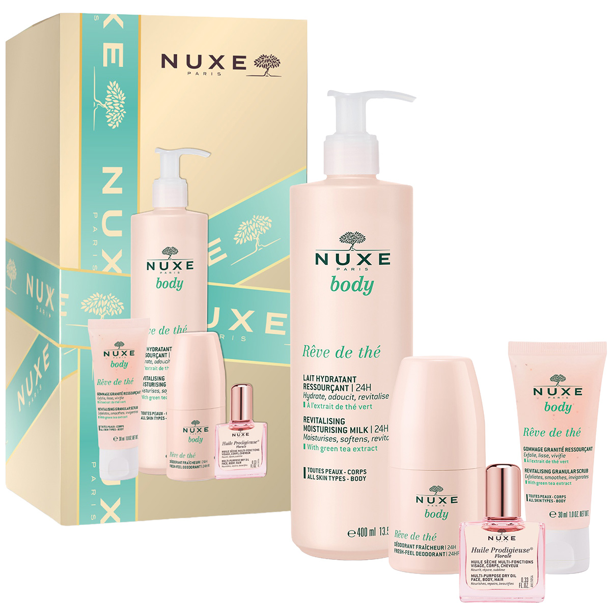 - REVE DE THÉ REVITALISING MOISTURISING MILK: AQUA/WATER, GLYCERIN, COCO-CAPRYLATE/CAPRATE, COCOS NUCIFERA (COCONUT) OIL, HELIANTHUS ANNUUS (SUNFLOWER) SEED OIL, BEHENYL ALCOHOL, PENTYLENE GLYCOL, ARACHIDYL ALCOHOL, PARFUM/FRAGRANCE, TOCOPHEROL, SACCHARIDE ISOMERATE, CARBOMER, SODIUM STEAROYL GLUTAMATE, ARACHIDYL GLUCOSIDE, CAPRYLYL GLYCOL, GLYCERYL CAPRYLATE, SODIUM GLUCONATE, SODIUM HYDROXIDE, CAMELLIA SINENSIS FLOWER EXTRACT, CITRIC ACID, SODIUM CITRATE, LIMONENE, CITRAL, LINALOOL, ALPHA-ISOMETHYL IONONE, GERANIOL. , MINI REVE DE THÉ SCRUB: AQUA/WATER, BAMBUSA ARUNDINACEA STEM EXTRACT, GLYCERIN, ALCOHOL DENAT., PENTYLENE GLYCOL, PARFUM/FRAGRANCE, SODIUM POLYACRYLATE STARCH, CITRIC ACID, XANTHAN GUM, SODIUM HYDROXIDE, 1,2-HEXANEDIOL, CAPRYLYL GLYCOL, SODIUM GLUCONATE, PRUNUS ARMENIACA (APRICOT) SEED POWDER, CAMELLIA SINENSIS FLOWER EXTRACT, ALPHA-ISOMETHYL IONONE, LIMONENE, LINALOOL. , REVE DE THÉ FRESH-FEEL DEODORANT: AQUA/WATER, TRIETHYL CITRATE, CELLULOSE, PENTYLENE GLYCOL, PARFUM/FRAGRANCE, GLYCERYL STEARATE CITRATE, CETYL ALCOHOL, POLYGLYCERYL-3 CAPRYLATE, PROPANEDIOL, HYDROXYACETOPHENONE, XANTHAN GUM, SODIUM GLUCONATE, ZINC GLUCONATE, ALLANTOIN, DEHYDROACETIC ACID, CITRIC ACID, GLYCERYL CAPRYLATE, GLYCERIN, LACTOCOCCUS FERMENT EXTRACT, CAMELLIA SINENSIS FLOWER EXTRACT, DECYL GLUCOSIDE, GERANIOL, CITRAL, ALPHA-ISOMETHYL IONONE, LIMONENE, LINALOOL., HUILE PRODIGIEUSE FLORALE: COCO-CAPRYLATE/CAPRATE, MACADAMIA INTEGRIFOLIA SEED OIL, DICAPRYLYL ETHER, CAPRYLIC/CAPRIC TRIGLYCERIDE, PRUNUS AMYGDALUS DULCIS (SWEET ALMOND) OIL, CORYLUS AVELLANA (HAZELNUT) SEED OIL, PARFUM/FRAGRANCE, CAMELLIA OLEIFERA SEED OIL, CAMELLIA JAPONICA SEED OIL, TOCOPHEROL, ARGANIA SPINOSA KERNEL OIL, BORAGO OFFICINALIS SEED OIL, TOCOPHERYL ACETATE, HELIANTHUS ANNUUS (SUNFLOWER) SEED OIL, ROSMARINUS OFFICINALIS (ROSEMARY) LEAF EXTRACT, POLYGLYCERYL-3 DIISOSTEARATE, ASCORBIC ACID, AQUA/WATER, LIMONENE, LINALOOL, CITRAL, CITRONELLOL, HYDROXYCITRONELLAL, GERANIOL [N2216/C].
