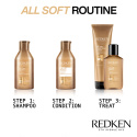 Redken All Soft -shampoon koostumus sisältää Redkenin Moisture Complex -ainesosayhdistelmän ja arganöljyä. All Soft -shampoo pehmentää ja kosteuttaa hiuksia tyvestä latvaan. Tämä shampoo puhdistaa hiukset ja tekee niistä silkinpehmeät sekä parantaa hiusten käsiteltävyyttä, sileyttä ja kiiltoa.