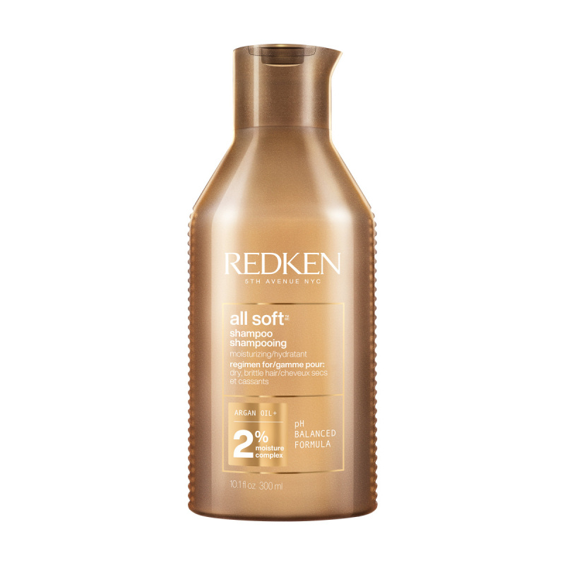 Redken All Soft -shampoon koostumus sisältää Redkenin Moisture Complex -ainesosayhdistelmän ja arganöljyä. All Soft -shampoo pehmentää ja kosteuttaa hiuksia tyvestä latvaan. Tämä shampoo puhdistaa hiukset ja tekee niistä silkinpehmeät sekä parantaa hiusten käsiteltävyyttä, sileyttä ja kiiltoa.