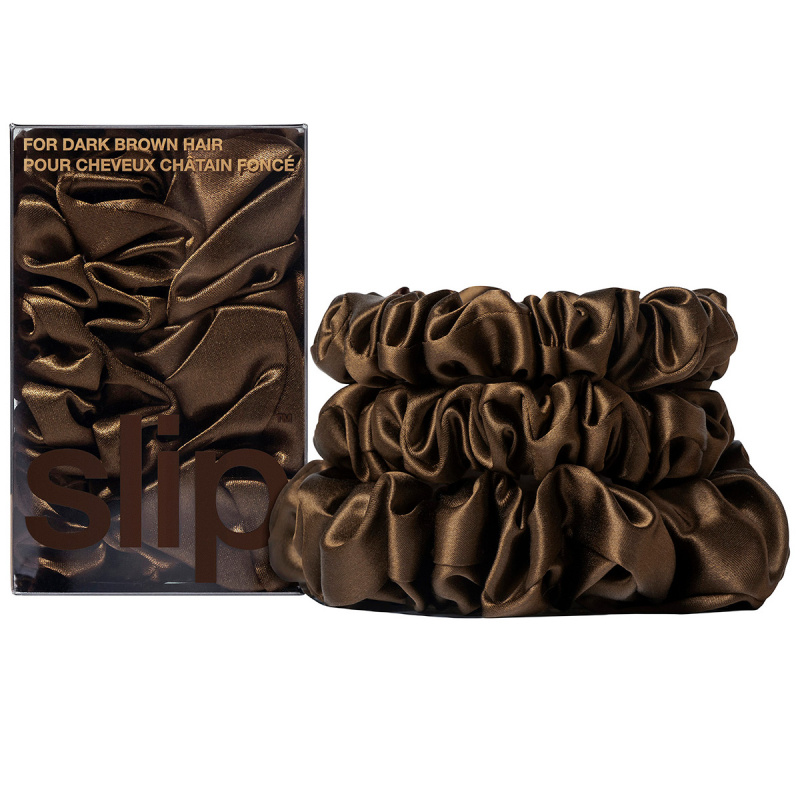 Sisältää: 2 x tummanruskea keskikokoinen scrunchie puhdasta silkkiä, 1 x tummanruskea iso scrunchie puhdasta silkkiä.