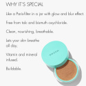 Miracle Mineral Powder Foundation toimii iholla kuin maaginen suodatin. Uskomaton koostumus tarjoaa sumeuttavan vaikutuksen ja luonnollisen säteilyn, joka saa ihosi hehkumaan. Puhtaan, talkkia ja vismuttioksikloridia sisältämättömän koostumuksen ansiosta ihosi voi hengittää koko päivän tukkimatta huokosia. Antioksidanteilla, mineraaleilla ja C-vitamiinilla rikastettu Miracle Powder sopii herkimmällekin ihotyypille. Levitä puuterisiveltimellä suoraan iholle tai meikkivoiteen päälle. Helppo rakentaa lisää peittävyyttä.